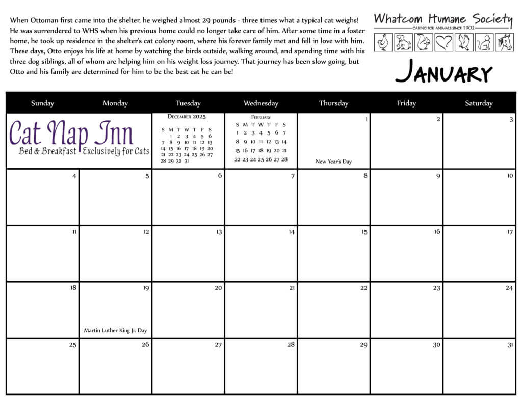 Support our work by picking up a calendar today: They can be found at our domestic animal shelter (2172 Division St), the WHS Thrift Shop (1534b Birchwood Ave), petStop in Sehome Village (326 36th St), and online*. (*If ordering online, an additional $3 per calendar is included to cover shipping.)